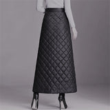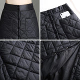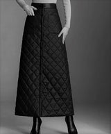 • Black high waist diamond quilted light weight A-line skirt women. We love a quilt and the natural solution was to extend it into a skirt. This beauty is gorgeously crafted with two front pockets and (count 'em!) 13 beautiful complementary press studs.