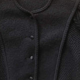 - Vintage black wool cardigan that has amazing detail and texture. Satin covered buttons. No size or brand labels. Excellent condition. Fits like S, could fit XS or M.