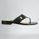 - We selectively add distinctive vintage pieces to complement our core range. These sandals fit our ethos and brand. One of a kind. Vintage square toe thong sandals by Bally in black leather. Minimal style, fine decorative strap and small gold colour buckle with Bally logo. Sandals are in excellent condition, have only minor marks on the outsole. Made in Italy. Size IT 38.5